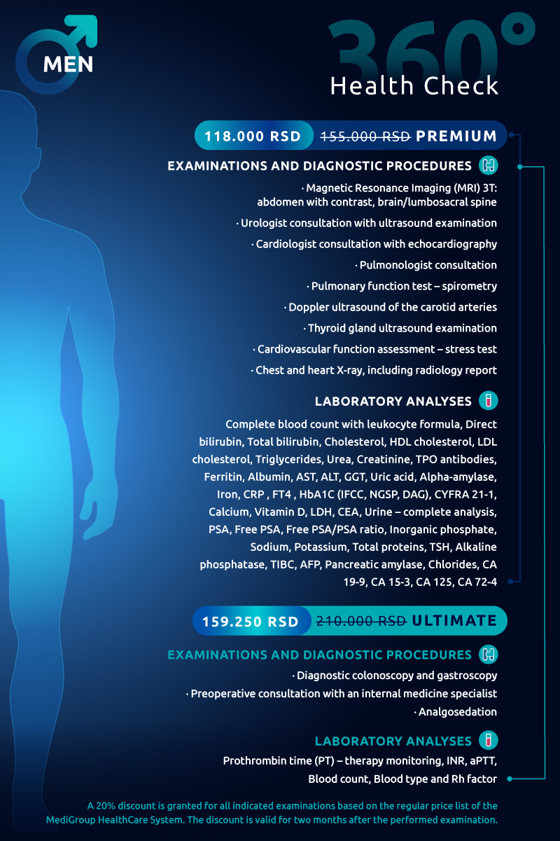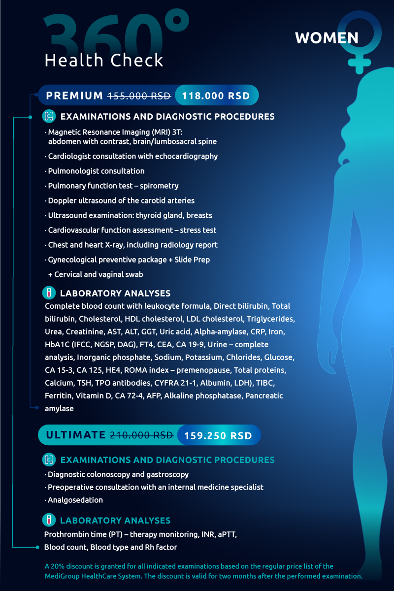 360° Health Check is a unique program of comprehensive preventive examinations and diagnostic procedures at MediGroup General Hospital, designed to provide a detailed assessment of your health status in a single or multiple visits, depending on the selected package.