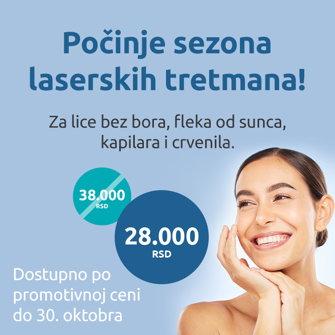 Specijalna pogodnost – dva tretmana po ceni od 28.000 RSD (umesto 38.000 RSD)! Volimo jesen jer počinje sezona laserskih tretmana – Candela laser briše bore, fleke od sunca, kapilare i crvenilo dermatološki precizno, nehirurški i efikasno. Rezervišite dva tretmana po promotivnoj ceni i osvežite svoju kožu odmah. Vidimo se na adresi Bulevar oslobođenja 189 u Beogradu.